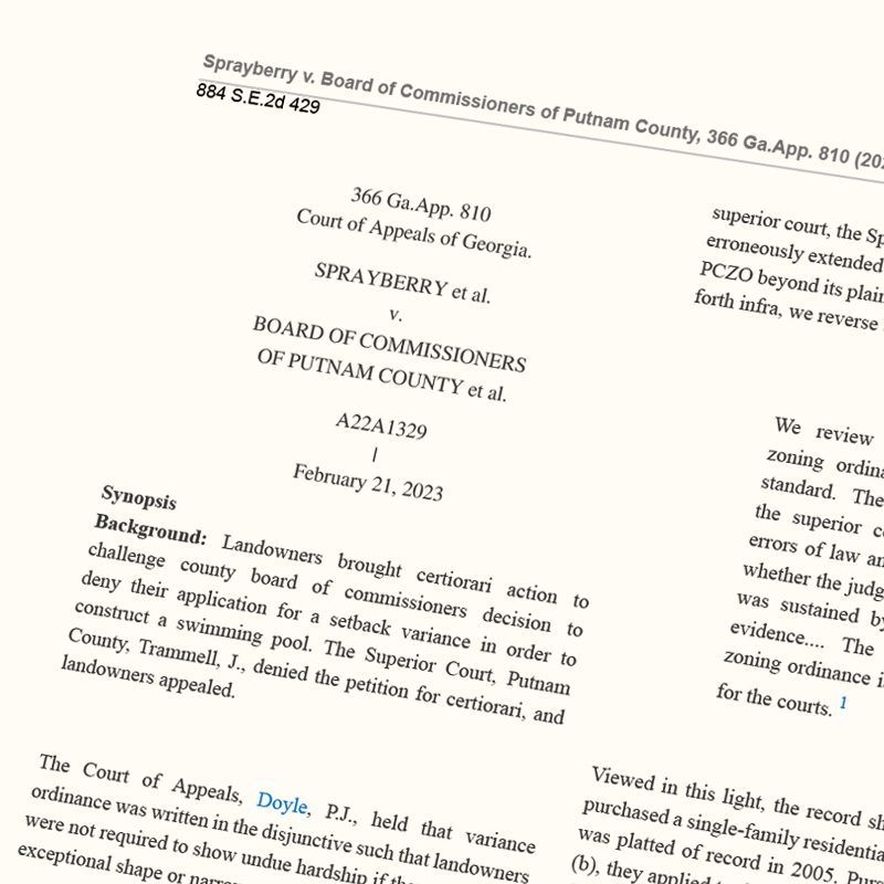 - Court of Appeals order in favor of client and against local government for denying a variance needed to construct a pool